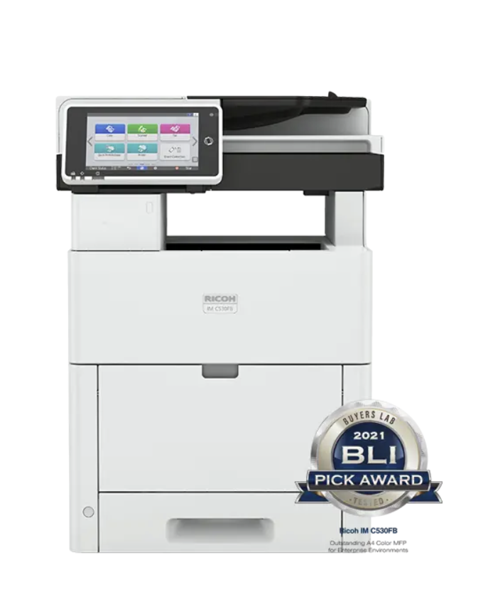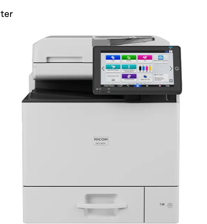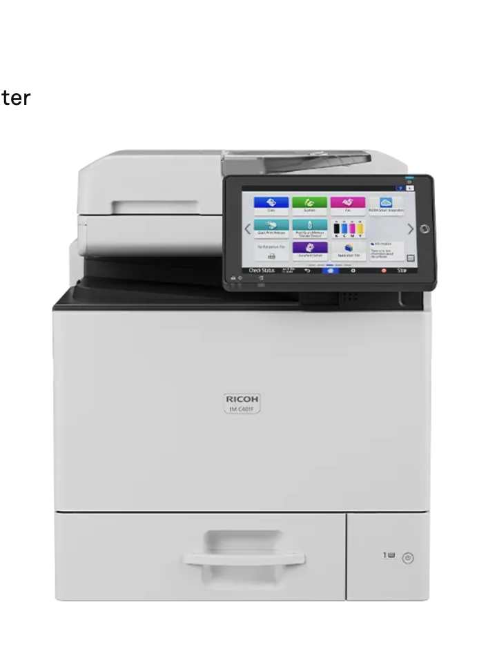 The IM C401F streamlines collaboration with reliable, intuitive performance. It prints up to 45 ppm with copy, scan, and fax functions. With a 1200 x 1200 dpi max print resolution and a paper capacity up to 2,300 pages, it enhances workflows with on-demand software and apps